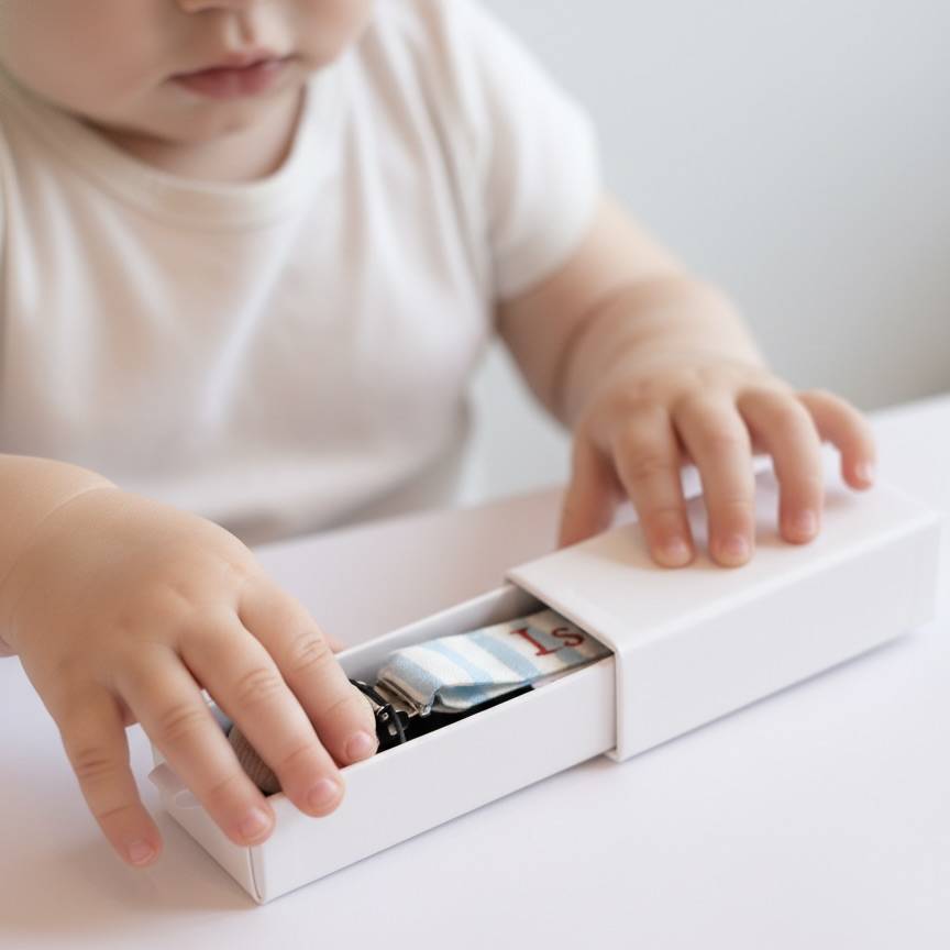 Pratique et légère, l’attache-tétine garde la sucette, l'anneau de dentition ou le doudou de bébé propre et à portée de main. Son adaptateur en silicone (certifié sans BPA) s’adapte facilement à chaque accessoire, et la fixation en bois s'attache facilement aux vêtements (certifiée aux normes EN 71-3:2010 + A1:2021). Elle est cousue au Portugal dans un joli tissu, très résistant et certifié OEKO-TEX. L'attache-tétine garantit sécurité et praticité au quotidien.Elle est livrée dans une magnifique boîte coulissante en carton épais, parfaite pour un cadeau de naissance élégant et haut de gamme.